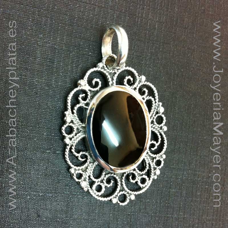 Colgante de azabache y plata, mod. colgante de azabache oval y filigrana de plata mediano.